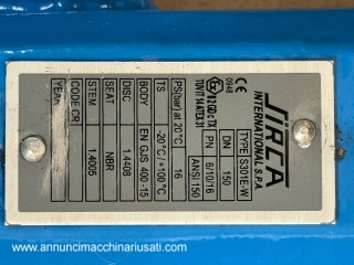 For sale Sirca manual valve model S301E-w Dn150 A Sirca manual closing butterfly valve type S301E-w is a device used to regulate the flow of fluids (such as water, gas, oil) in a piping system. Below is a description of the main features: ### **How ​​it is made** - **Valve body**: Generally made of cast iron, stainless steel or other corrosion-resistant materials. - **Disc**: A central disk that rotates to regulate flow. It can be made of stainless steel or other resistant materials. - **Manual actuator**: A lever or handle to manually operate the valve. - **Seals**: In materials such as EPDM, NBR or PTFE, to guarantee tightness and prevent leaks. ### **What is it for** It is used to control the flow of fluids in a system, allowing the fluid passage to be opened, closed or partially regulated. ### **Constituent elements** 1. Valve body. 2. Closing disc. 3. Rotation shaft. 4. Seals. 5. Lever or handle for manual closing. ### **Types of butterfly valves** - **With manual closing**: Operated by lever or handwheel. - **With pneumatic or electric actuator**: Automated for remote control. - **With wafer or lug flange**: Different types of assembly for insertion between pipes. ### **Materials** Used for the control of fluids such as water, gas, oil, and even chemically aggressive fluids, depending on the construction material. ### **Why buy in stock** - **Economic convenience**: Buying in stock reduces the unit cost. - **Immediate availability**: Having a ready supply in the warehouse guarantees speed of intervention. - **Prevention of interruptions**: Minimizes the risks of plant downtime due to maintenance or repairs.