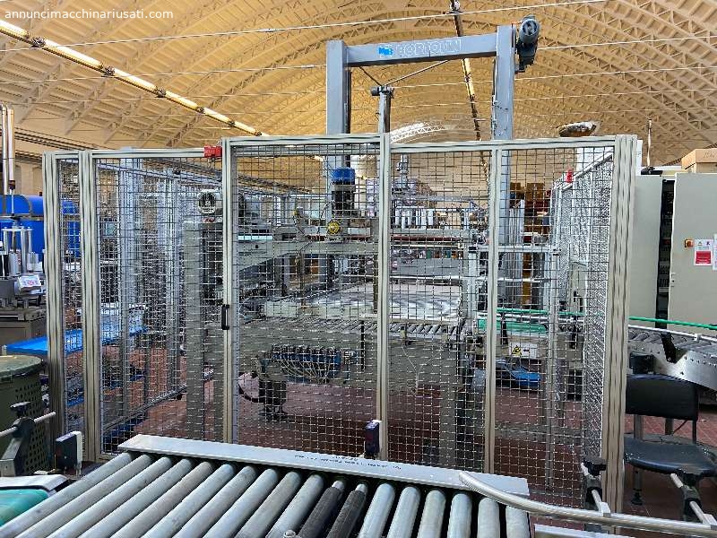 The operator loads the platform onto a roller conveyor and can hold three full pallets. The operation consists in cutting the foreground using a rotating blade that cuts the upper part at the height of the flap, thus keeping all the bottles compact.