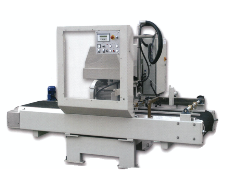 Automatic cross cutter machine single disk for marble and granite, solid structures designed to support and move heavy slabs; – support table made of a thick motorized rubber belt with the possibility of automatically setting material feed to the dimension selected by the machine operator on the keyboard; employ an inverter that controls spindle carriage feed with speed slow down during terminal phases to reduce workpiece breakage and with fast -unit return speed to reduce processing times; – both manual and automatic cycles: the machine operator selects the best cycle depending on the material being processed and the products to be made; The machine operator sets the depth of each pass depending on the type of material being processed; – controlled by an electronic computer that monitors and manages processing phases and can different cycles for maximum flexibility and greater reliability; – equipped with an alphanumerical keyboard for setting and selecting cut cycles; work with a belt-drive motor/spindle system with the possibility of changing RPM according to the material to be cut; Mod. GUGLIELMI ATTS B01H600M Cod. 14-22