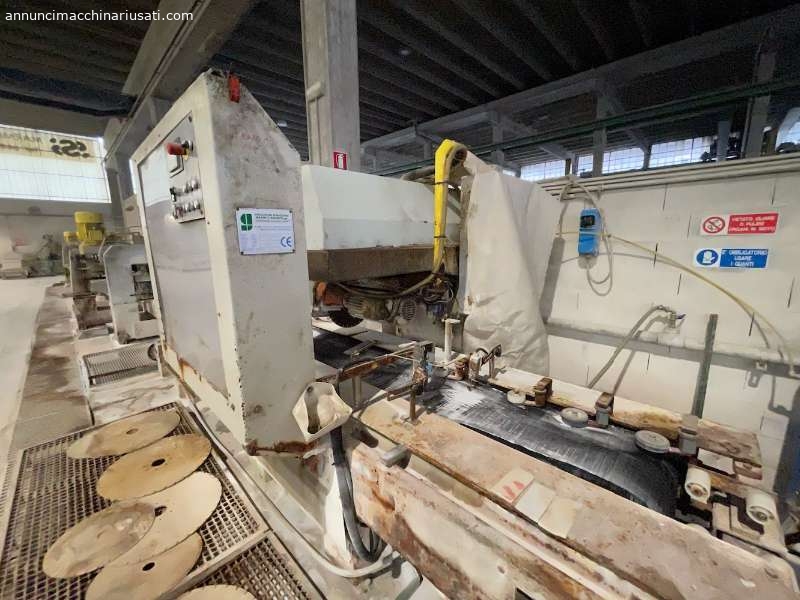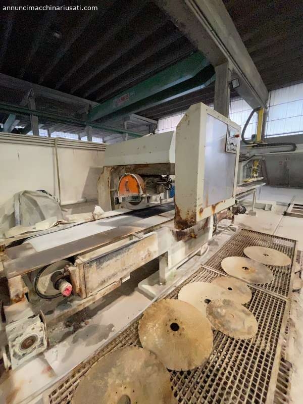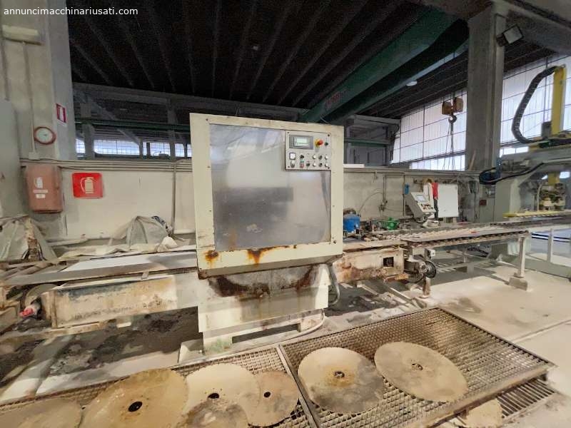 ATTESTATRICE AUTOMATICA MONODISCO MARMO GRANITO RETTILINEA,- ha una struttura solida atta a sostenere e movimentare lastrati pesanti; – ha il piano d’appoggio formato da nastro in gomma di grosso spessore motorizzato, con possibilità d’impostare l’avanzamento automatico del materiale, alla quota scelta dall’operatore su tastiera e indicando con gesso, si giova di un inverter che gestisce l’avanzamento del carro porta mandrino con rallentamento della velocità di taglio nella fase terminale per eliminare rotture del materiale ed è completa di ritorno rapido del gruppo di taglio, puó lavorare sia in automatico che con ciclo manuale permettendo all’operatore la scelta migliore in dipendenza del materiale e della produzione da ottenere; è dotata di tastiera alfanumerica per l’impostazione e la scelta dei cicli di taglio; – offre all’operatore il vantaggio di effettuare tagli a misura grazie ai riscontri mobili a scomparsa di cui è provvisto il banco Mod. GUGLIELMI ATTS B01H600M Cod. 14-22