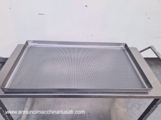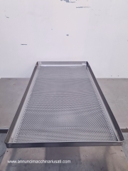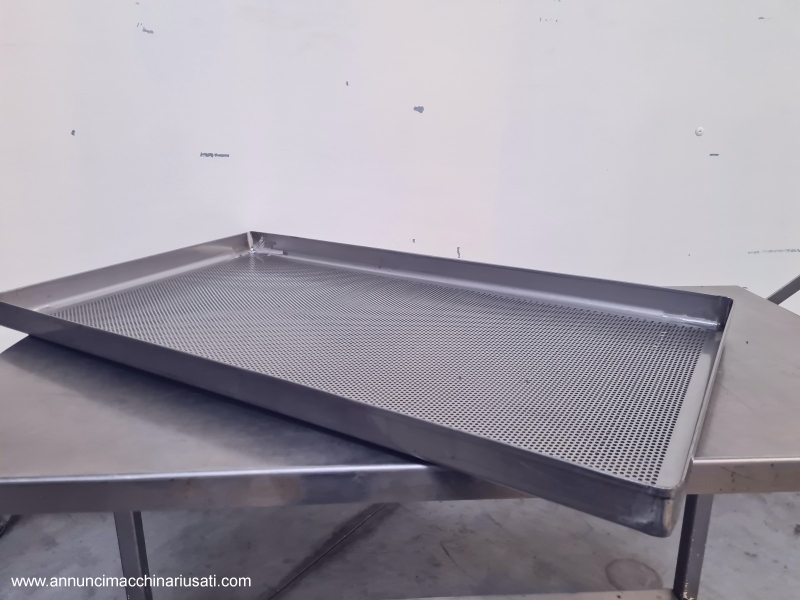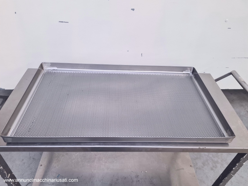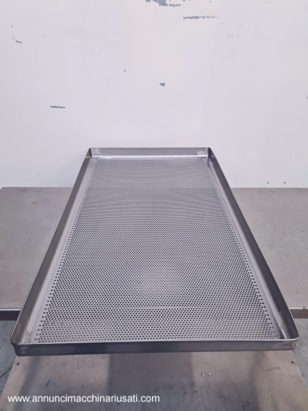 TIPOLOGIA DEL MACCHINARIO: Arelle per forno realizzate in acciaio inox, progettate per applicazioni di cottura, essiccazione e trattamenti termici in ambito industriale/alimentare. SETTORE DI IMPIEGO: Farmaceutico, chimico, cosmetico, alimentare, dietetico, manifatturiero PECULIARITA’: La superficie è costituita da lamiera microforata, che consente un’ottimale circolazione dell’aria e una distribuzione uniforme del calore, favorendo processi omogenei sul prodotto trattato. La struttura presenta bordi rialzati e rinforzati, utili per il contenimento del materiale e per garantire maggiore rigidità e resistenza alle deformazioni durante l’utilizzo. La costruzione solida e la finitura in acciaio inox assicurano elevati standard igienici, facilità di pulizia e durabilità nel tempo, rendendo queste arelle idonee all’impiego in contesti produttivi dove sono richieste affidabilità e conformità ai requisiti sanitari. SPECIFICHE TECNICHE Unità disponibili: 28 Dimensioni (LxPxH) mm: 785 x 445 x h 40