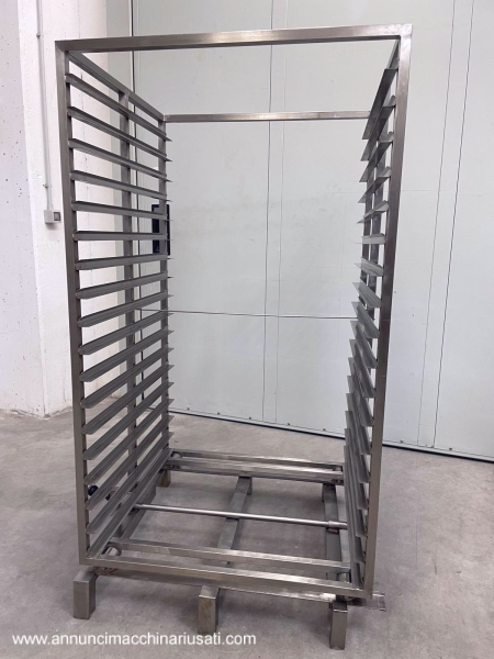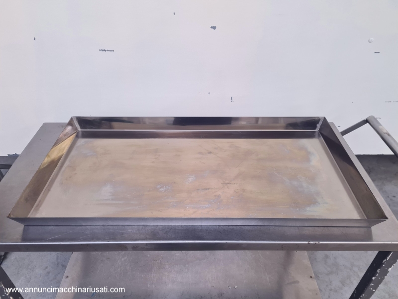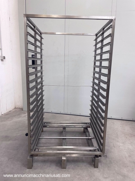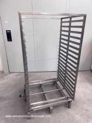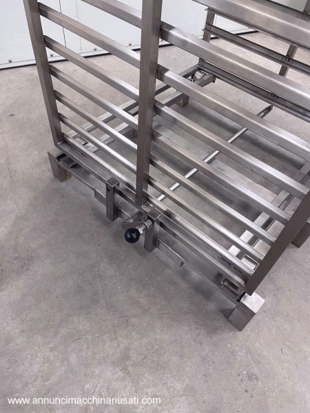 TIPOLOGIA DEL MACCHINARIO: Sistema composto da arelle per forno in acciaio inox abbinate a n. 2 carrelli trasportatori. SETTORE DI IMPIEGO: Farmaceutico, chimico, cosmetico, alimentare, dietetico, manifatturiero PECULIARITA': Progettato per applicazioni di cottura, essiccazione o trattamenti termici in ambito industriale/alimentare. Le arelle, a fondo pieno, presentano bordi perimetrali rinforzati per garantire stabilità e resistenza durante il ciclo produttivo. I carrelli, realizzati in acciaio inox, sono dotati di guide laterali multiple per l’alloggiamento ordinato delle arelle, struttura robusta e sistema di movimentazione che consente un agevole inserimento ed estrazione all’interno dei forni. L’insieme costituisce una soluzione completa, funzionale e igienicamente idonea, pensata per ottimizzare la gestione dei carichi e l’efficienza operativa nei processi termici. N.carrelli: 2 N. arelle disponibili: 57 Dimensioni arelle (LxPxH) mm: 800 x 400 x h 45 PROGITEC
