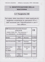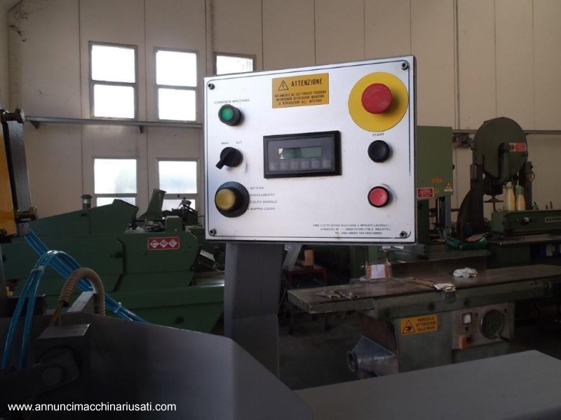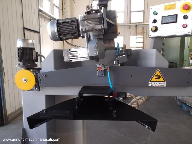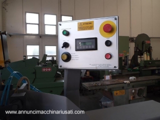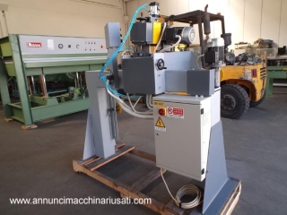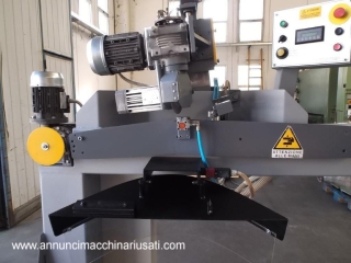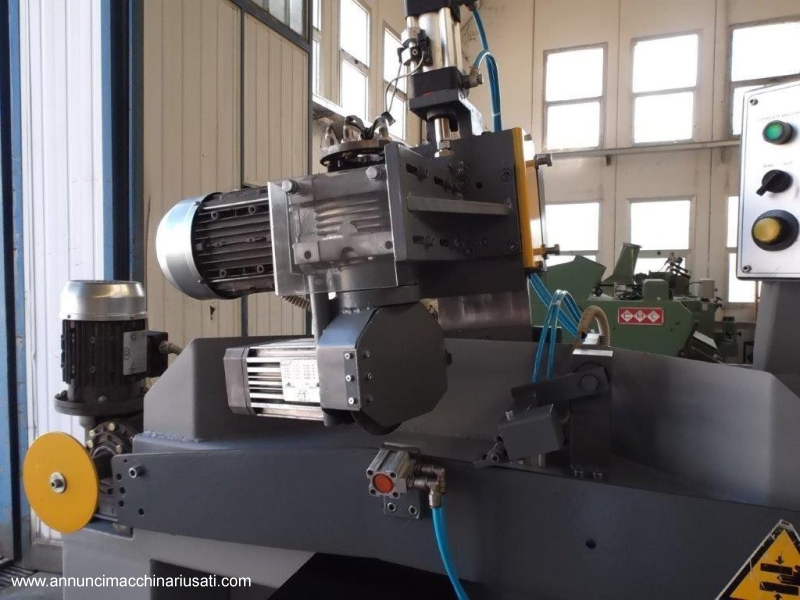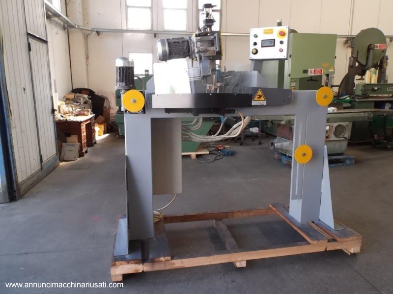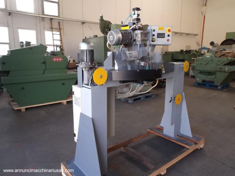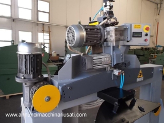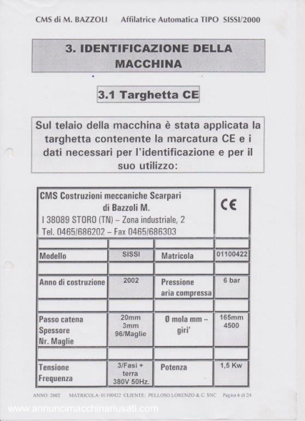 Affilatrice per catene di motoseghe e tagliapacchi - CMS SISSI/2000 anno di costruzione 2002 macchina a norme CE lunghezza catena lavorabile da 3600 a 4500 mm stazione di molatura con motore da 0,55 kw per mola diametro 165 mm n. 3 sensori per regolazione angolo di affilatura gruppo di trascinamento catena con motore da 0,37 kw voltaggio 400V-50Hz-3ph manuale d'uso e certificato CE ingombro per il trasporto 2000x800x1800h mm peso 250 kg