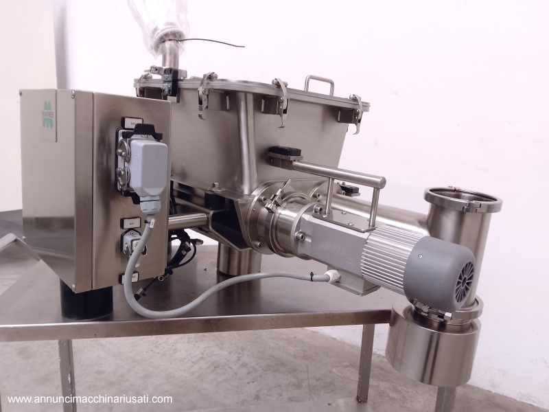 TIPOLOGIA DEL MACCHINARIO: Caricatore forzato per polveri SETTORE DI IMPIEGO: industria farmaceutica, alimentare, cosmetica, chimica fine PECULIARITA': Il caricatore Forzato MANES Modello HDS 90/2 è un sistema di alimentazione automatico specificamente progettato per la gestione e l'introduzione controllata di polveri nelle comprimitrici. Realizzato in acciaio inossidabile, è ideale per ambienti che richiedono elevati standard igienico-sanitari e resistenza alla corrosione. Il cuore del sistema è un'unità vibrante che, attraverso una tramoggia di carico, convoglia il materiale tramite coclee gemellate. Le dimensioni delle coclee garantiscono un trasporto forzato e un dosaggio preciso, suddividendo il flusso verso una doppia uscita prodotto. Questo design a doppia uscita e con coclee gemellate è ottimizzato per alimentare contemporaneamente la tramoggia di carico di due stazioni di comprimitrici, garantendo un flusso continuo e bilanciato del materiale. L'integrazione di sensori di fine corsa o di presenza prodotto permette un controllo preciso del processo di alimentazione, evitando sovraccarichi o interruzioni, il tutto in una struttura compatta e modulare pensata per una facile integrazione e pulizia. Tipologia Prodotto: Polveri Ingresso Prodotto: Diametro 300 mm Uscita Prodotto: Doppia uscita, Diametro 150 mm Misure Coclea: Diametro 70 mm - Lunghezza 640 mm Peso: 60 kg