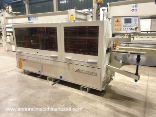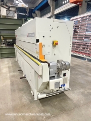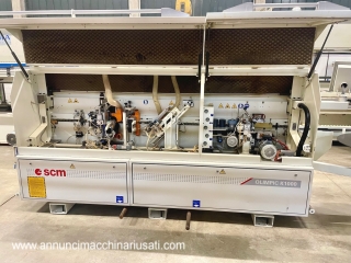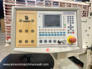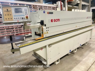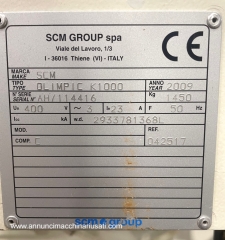 Bordatrice SCM mod. OLIMPIC K1000 usata pannello di controllo con tastiera a membrana Dati tecnici: Altezza min. del pannello 8 mm Altezza max. del pannello 55 mm Spessore min. del bordo in rotolo 0.4 mm Spessore max. del bordo in rotolo 3 mm Spessore max bordo in legno mm. 12 Composizione: Magazzino bordo in strisce Vasca colla capacità kg. 1,5 con motore indipendente Nr. 4 rulli di contropressione con spinta pneumatica e I° rullo con motore indipendente Cesoia taglio bordo in rotolo Gruppo intestatore con 2 motori indipendenti inclinabili 0-15° - cad. KW 0,35 - 12.000 rpm Gruppo refilatore sovrapposto con 2 motori cad. KW 0,65 - 12.000 rpm - utensili con coltelli reversibili Gruppo spigolatore inclinabile per esecuzione di finitura piana-spigolo e raggio; r. 2 motori cad. KW 0,5 - 12.000 rpm con posizionamento elettropneumatico  - utensili con coltelli reversibili esclusione elettropneumatica del gruppo Gruppo raschiacolla Lunghezza macchina mm. 4310 Anno di fabbricazione 2009 CE