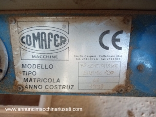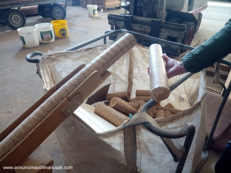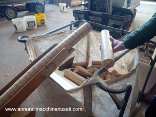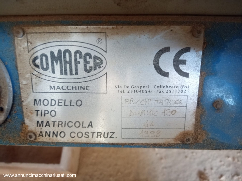 Bricchettatrice COMAFER modello DINAMIC 120: – diametro bricchetti 70mm – produzione oraria da 50 a 130 kg/h – centralina idraulica HP 10 , volt 380 – diametro tramoggia D=1000mm – con sportello di ispezione – con sonda di livello – misure ingombro mt 2 x 1,2 x h=1,5 – peso kg 900 – anno 1998 , a norme CE