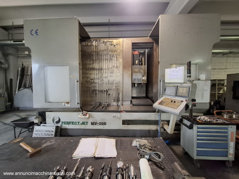 Centro di lavoro verticale pendolare a 3 assi CNC a norme CE dotato di controllo numerico Fanuc 0i-MC INSTALLAZIONE MACCHINA: anno 2006 - 03 ACCESSORI MACCHINA: - Frigo mandrino - Alta pressione al mandrino 15 Bar - Evacuatore trucioli a tappeto - Paratia divisoria per lavorazione in pendolare - Magazzino cambio utensili a ruota fissato sulla parte sinistra della colonna e mobile insieme ad essa -Circa 30 coni a corredo Specifiche Produttore PERFECT JET Modello MV-206 Anno 2006 Condizione Usato Numero di serie Rif. etichetta macchina Numero di magazzino C121221025 Dimensioni tavola 2500x600 mm Cave a T (nr./dimensione/interasse) 5 nr. / 18 mm / 105 mm Peso ammesso sulla tavola 1000 Kg Corsa asse longitudinale X 2000 mm Corsa asse trasversale Y 600 mm Corsa asse verticale Z 550 mm Distanza naso mandrino - piano tavola 180 - 730 mm Distanza centro mandrino - colonna 675 mm N.2 zone di lavoro in pendolare 500x600x550 mm / 700x600x550 mm Attacco mandrino DIN 69871 / 40 Velocità di rotazione 100-10000 min-1 Magazzino utensili 40 nr Avanzamenti in rapido assi X/Y/Z 30/30/24 m/min Potenza motore mandrino 15/18,5 kW Dimensioni macchina (con evacuatore) 5800x3140xH3420 Peso della macchina 14000 Kg