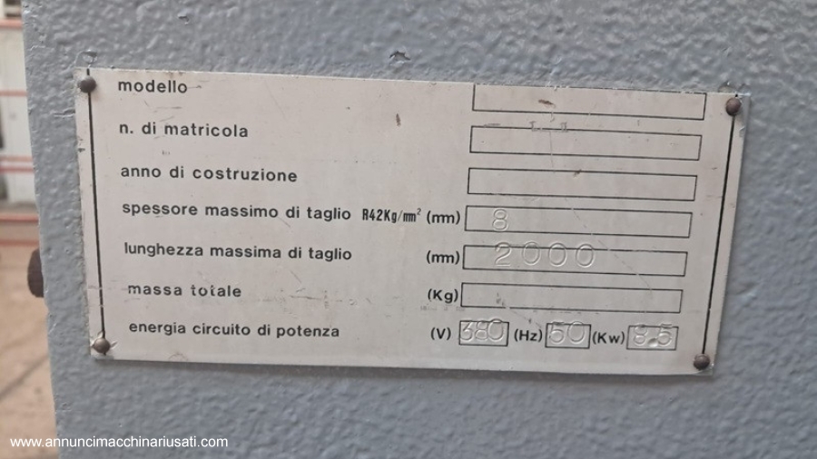 Cesoia A Ghigliottina Meccanica Romea 2000 X 8 Modello: Rcci 20-8 Capacità Di Taglio: 8 Mm. Lunghezza Di Taglio: 2.030 Mm. Incavo: 500 Mm. Potenza Motore Principale: 8,5 Kw. N. Colpi Al Minuto: 48 Angolo Di Taglio: 1° 54' Peso Totale: 7.100 Kg. Registro Motorizzato Corsa 600 Mm. Codice Interno: SVR-351
