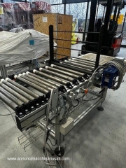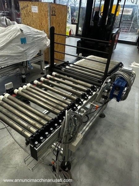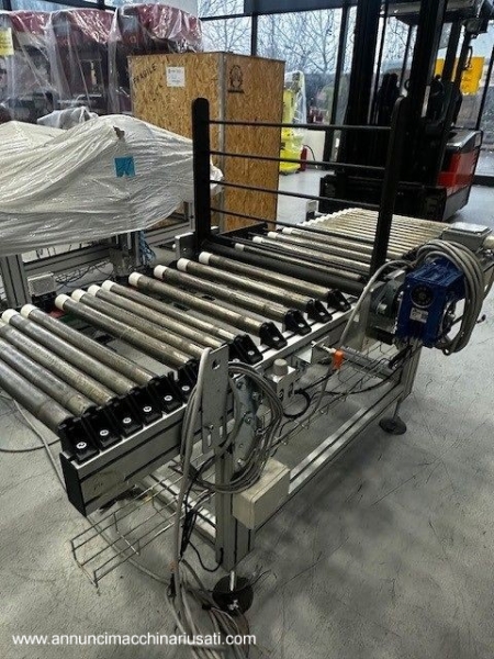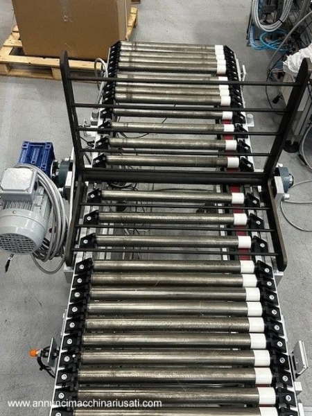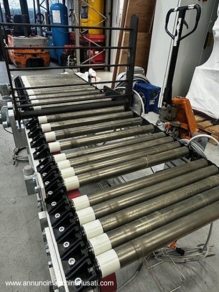 Impianto per movimentazione e trasporto materiali vari quali cassette o cartoni di bottiglie, cassette in legno, prodotti alimentari o altro utilizzato in linee produttive. Questo impianto è composto a un totale di 23 rulliere motorizzate singolarmente, ognuna con una larghezza di 500 mm ed altezza 700 mm. Distanza tra i rulli 40 mm e ricoperti in poliuretano trasparente per aumentare la presa. Misure e caratteristiche di ogni singola rulliera: 5 rulliere da 2500 mm con sponde fisse 4 rulliere da 1800 mm con sponde fisse 2 rulliere da 1800 mm con spintori pneumatici 2 rulliere da 1800 mm con sponde mobili e spintori pneumatici 8 rulliere da 1300 mm con sponde mobili 2 rulliere da 1600 mm con sponde fisse e sistema ribaltatore a 90° PS: Gli spintori servono a spostare la merce a 90° sulla prossima rulliera. Tutto può essere venduto singolarmente e ogni pezzo è indipendente dagli altri. Video dell'impianto in funzione disponibile. Inoltre possono essere aggiunti 2 robot manipolatori VM-60B1 prodotti dalla Denso, (venduti separatamente) Per informazioni tecniche e prezzi contattateci e vi sapremo rispondere ad ogni domanda.