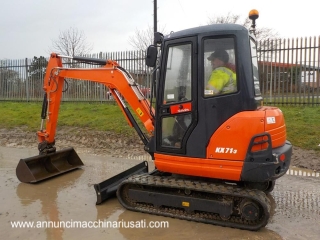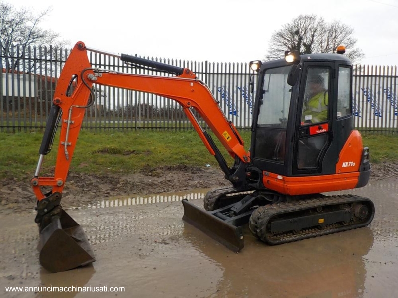 Marca: Kubota Modello: KX71-3 Tipo: miniescavatore Anno: 2015 Ore: 398 h Potenza: 28 CV Carburante: Diesel Stato : Usato - ottimo stato Certificazione CE: Sì Garanzia macchina: Sì Peso operativo: 2800 Kg Miniescavatore Kubota KX71-3 del 2015, cingoli in gomma, lama, offset, CV, tubazioni ausiliarie, attacco rapido idraulico, aria condizionata in cabina, motore Kubota modello V1505-E2-BH-10EU, potenza motore: 20,5 kW / 88 CV. Il potente e affidabile motore Kubota offre una potenza economica ed ecologica. L'efficienza del motore è così efficiente che un pieno di carburante gli consente di lavorare per più di 10 ore. Capacità benna: 0,07 mc, Profondità di scavo: 2,68 mt, Larghezza cingoli: 300 mm, Lunghezza macchina: 3,320 mt, Larghezza macchina: 1,5 mt, Altezza macchina: 2,410 mt, Sistema di lubrificazione automatica, funzionamento martello idraulico,Peso operativo: 2800 Kg .Miniescavatore pronto al lavoro con tutta la documentazione in regola e certificazione C.E. Garanzia del concessionario - 12 mesi.
