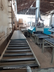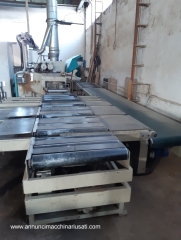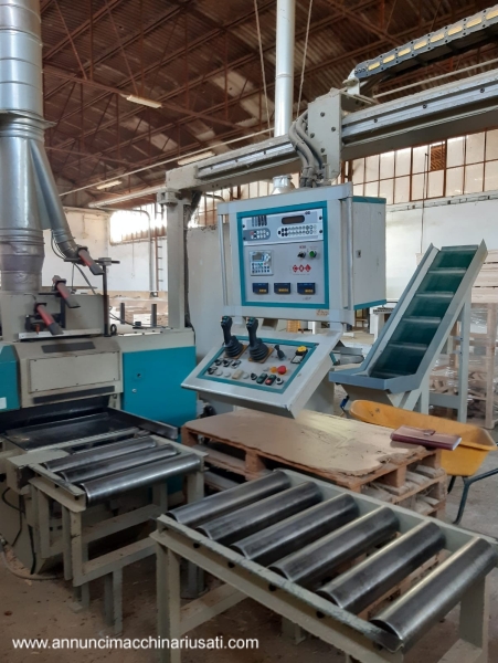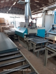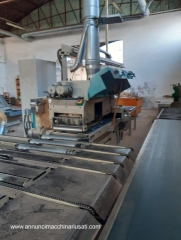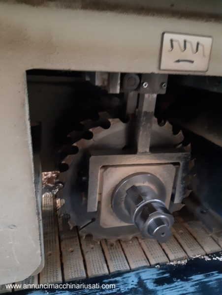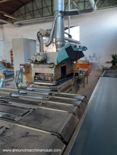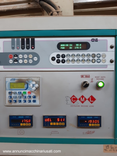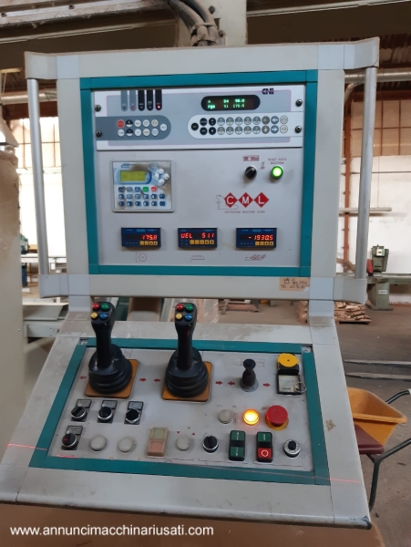 Multilame a 2 lame mobili CML modello SCA320 2R T350 , con linea di separazione e ritorno pezzi all’ operatore: – gestione macchina da quadro comandi separato, con: * programmatore elettronico CNI * 2 joystick per gestione delle 2 unità a lama mobile * velocità di avanzamento variabile (inverter), con display digitale * posizionamento motorizzato del gruppo lame, con display digitale * posizionamento motorizzato del pressore, con display digitale * posizionamento motorizzato della guida in ingresso macchina – 1 lama fissa + 2 lame mobili a ricircolo – 1 laser fisso + 2 laser mobili, per linee di taglio – tappeto da 350mm, larghezza utile di taglio 320mm – diametro lame da 220 a 350/360mm max – altezza utile di taglio con lame mobili da 360mm: 100mm – altezza utile di taglio con lame mobili da 350mm: 95mm – altezza utile di taglio con canotto fisso e lame da 350mm: 120mm – motore lame kw 37 / hp 50 – potenza totale kw 40 / hp 55 – pompa di lubrificazione automatica – linea di separazione motorizzata in uscita della macchina, con scarico dei pezzi tagliati sul lato destro, e ritorno pezzi all’ operatore sul lato sinistro – ingombro complessivo circa mt 10 x 4 Anno 2004 , a normative CE