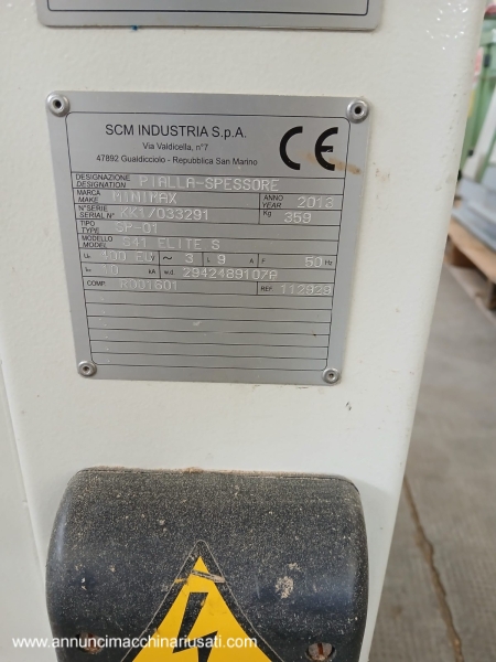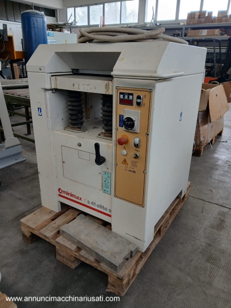 Pialla a spessore MINIMAX modello S41 ELITE S: - larghezza utile di lavoro 410mm - spessore utile di lavoro da 3 a 240mm - sollevamento motorizzato con visualizzatore digitale - albero a 4 coltelli normali - potenza motore kw 4 / hp 5,5 , volt 380 - 2 velocità di avanzamento 6 – 12 mt/min Anno 2013 , normative CE