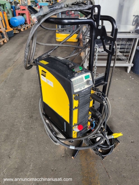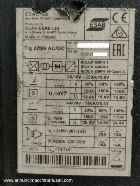 VISIBILE A RIVOLI (TO) Vendesi saldatrice professionale Esab Tig2200i AC/DC con pannello di controllo TA34, completa di gruppo di raffreddamento. Alimentazione 220V. Descrizione dal sito del produttore: Saldatura TIG AC/DC con innesco HF alta frequenza o LiftArc, ed elettrodo. Costruzione robusta e resistente agli impatti, con connettore cavo OKC 50. Ideale per la saldatura di tutti i tipi di materiale, incluso alluminio, fino ad uno spessore di 5 mm. TIG DC Pulsato per un maggiore controllo dell’apporto termico e del bagno di saldatura. Il pannello TA34 presenta un display digitale per le regolazioni e offre due posizioni di memoria per salvare i parametri di saldatura. Funzione Micro Pulsato per minimizzare l’apporto termico, particolarmente indicato per spessori sottili e sottilissimi. Curva di salita/discesa e post gas regolabili. Possibilità d’uso con controllo remoto. Funzione ArcPlus II regolabile per una migliore qualità di saldatura in elettrodo, minimizzando i trattamenti post saldatura. Può operare anche con cavi di alimentazione anche molto lunghi, fino a 100 m, grazie al circuito PFC di cui è dotata. Standard di isolamento IP 23 – per uso sicuro anche all'aperto in tutti i luoghi di lavoro. Usata ma in ottime condizioni, solo da pulire. Richiesta Euro 1.500,00 oltre iva.