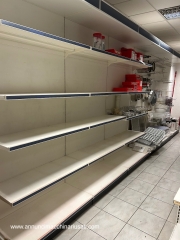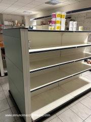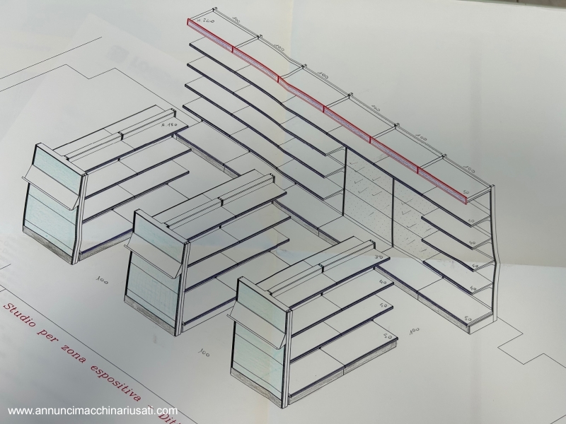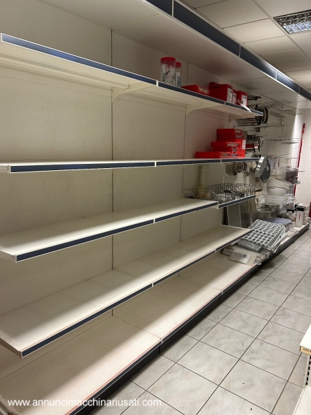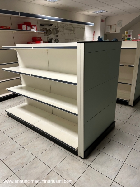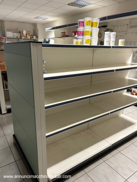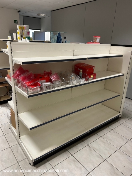 Scaffalature a gondola e lineare per negozi Così composte: 3 scaffalature a gondola doppia 200x103,5 h=154 1 scaffalatura lineare 600x h=250 Complete di porta etichette e accessori per l’esposizione degli articoli Prezzo escluso iva