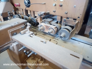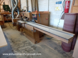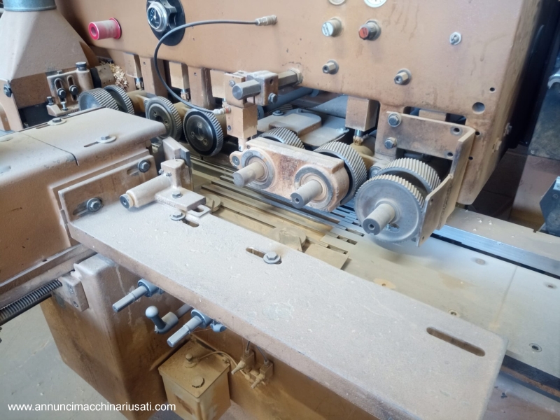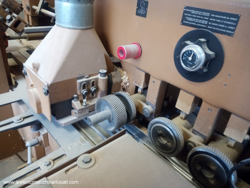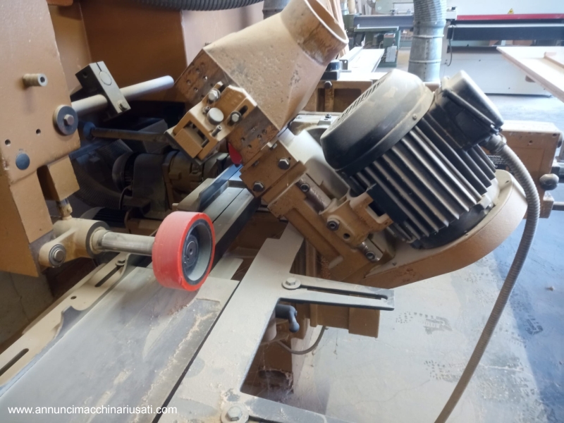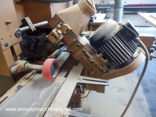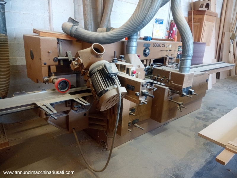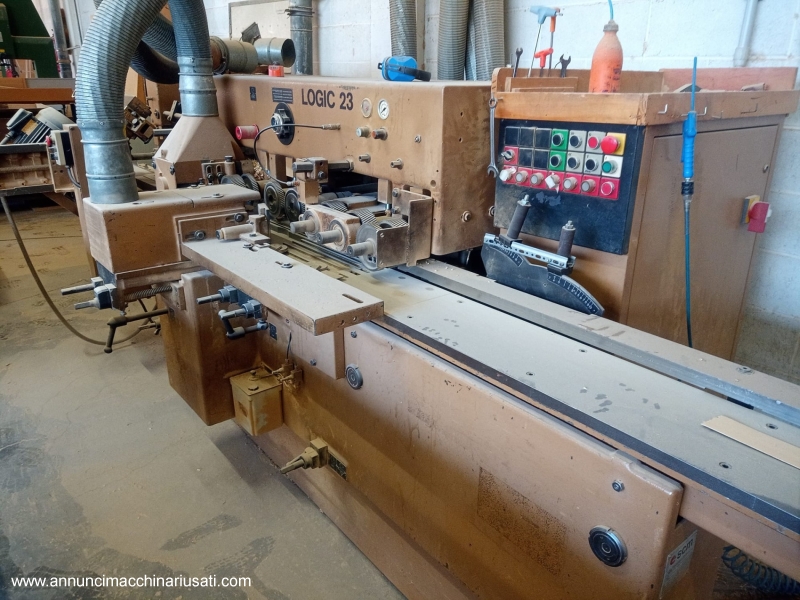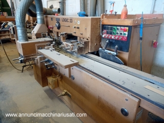 Scorniciatrice SCM modello LOGIC 23 a 6 alberi: - misure utili di lavoro 230x120mm - traino cardanico e pressione pneumatica - velocità di avanzamento 4 - 32 mt/min con motovariatore - gruppo di avanzamento superiore prima del 1° albero - gruppo di avanzamento tandem di fronte al 2° albero - piano di ingresso da 2500mm - piano scanalato dal 1° al 5° albero - pompa di lubrificazione del piano - alberi D=40mm a 6000rpm - diametro massimo utensili a profilare 200mm - completa di teste portacoltelli elicoidali Alberi: 1- sotto 2- destro 3- sinistro 4- sopra 5- sotto 6- universale Macchina non a normative CE, per export