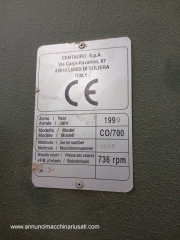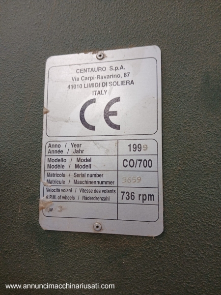Sega a nastro in acciaio CENTAURO modello CO700: - con volani pieni da 700mm - motore kw 3 / hp 4 , volt 380 - piano inclinabile fino a 20° - guidalama superiore - peso kg 400 circa Anno 1999 , normative CE