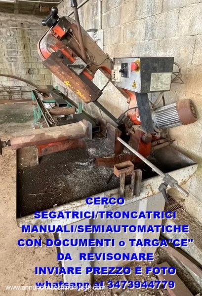 SEGATRICI/TRONCATRICI MANUALI/SEMIAUTOMATICHE (NO AUTOMATICHE/CNC) CON DOCUMENTI o TARGA"CE" DA REVISONARE INVIARE PREZZO E FOTO