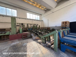 SEGATRONCHI PRIMULTINI SE-CEA-IEA 1100 DESTRA CON CARICATORE E SCARICATORE 1) COLONNA SE 1100 volani da 1100X120 mm per lame da 130X7500 mm tendilama e guidalama elettrici motore da 50 hp con avviatore automatico 2) CARRO CEA-IEA n. 4 morse con chiusura ed uscita ganci elettrica apertura morse 900 mm n. 2 giratronco idraulici spessori elettrici avanzamento idraulico a fune lunghezza binario 16,5 m quadro comandi 3) AUTOMAZIONE COMPLETA DI : - caricatore tronchi a 4 vie da 5000 mm - n. 4 vasche con bracci spingitronco comandati da centralina idraulica separata - rulliera motorizzata da 6000 mm a rulli elicoidali con n. 3 bracci prenditavole pneumatici - barriera di scarico finale motorizzata a catena - scivoli di raccolta 4) DISEGNO DI FONDAZIONE E MANUALE D’USO