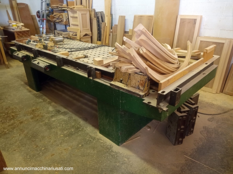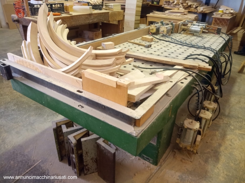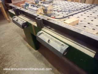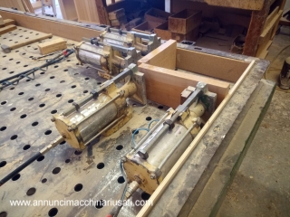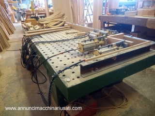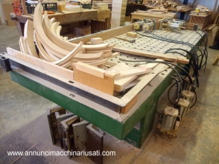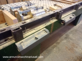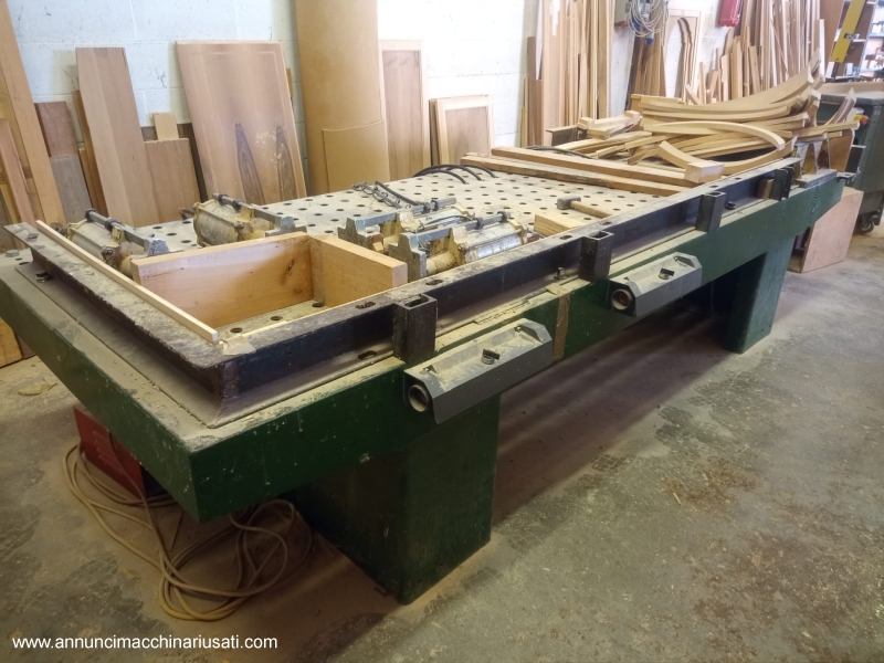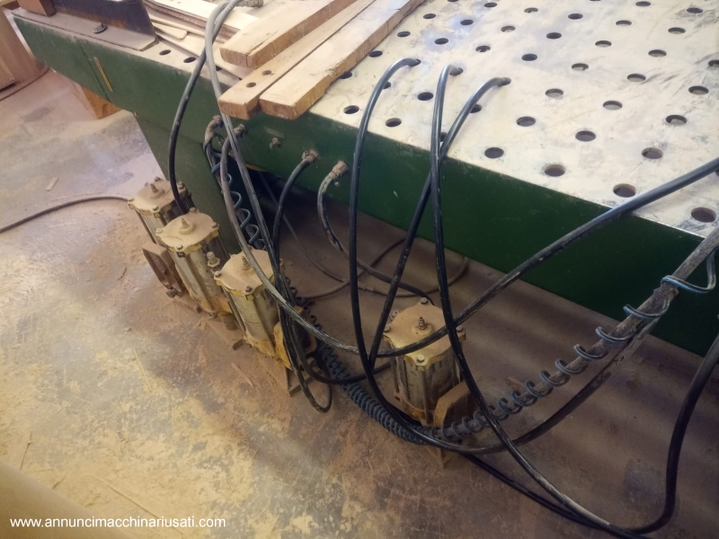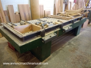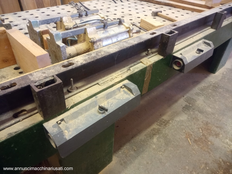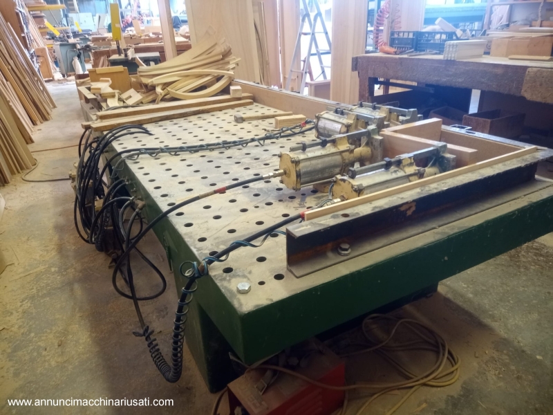 Strettoio pneumatico a banco VALENTINI modello C2P: - ingombro circa 3,5 x 1,3 mt - 2 postazioni di lavoro - con 8 pistoni e squadre di appoggio