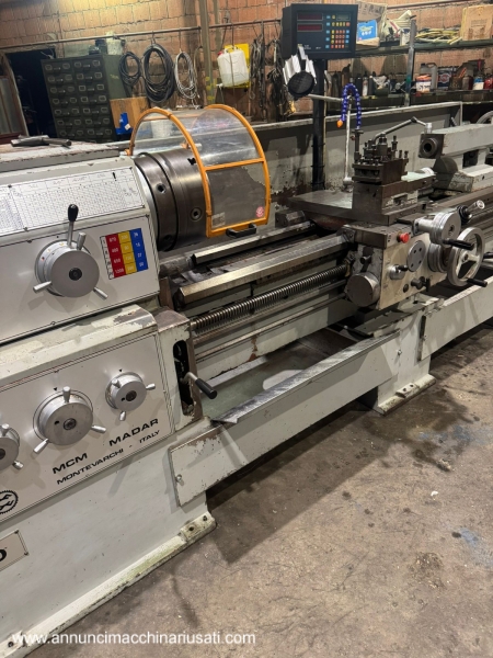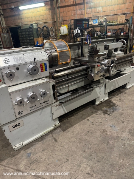 Tornio parallelo usato in pronta consegna Marca MCM Madar Lunghezza utile di tornitura 2000 mm Altezza punte 260 mm Foro mandrino 82 mm Rapidi sul carro Completo di autocentrante a 3 griffe Lunetta Torretta porta utensili Visualizzatore di quote a 2 assi Libro istruzioni Certificazione di conformità