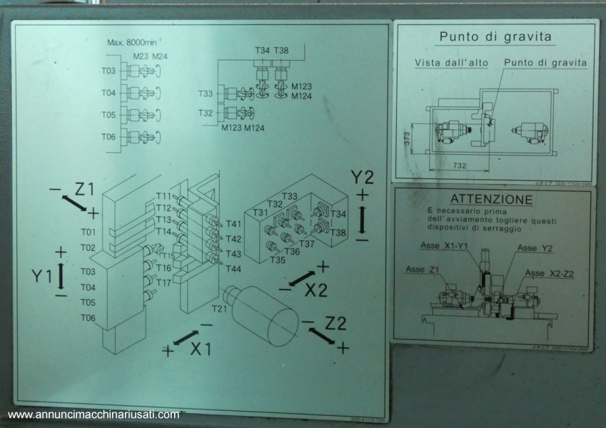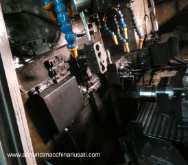 Tornio modello B0 206E III Caratteristiche principali: Anno di costruzione 2015 Massimo diametro tornibile 20 mm Velocità mandrino principale 200-1200 RPM Velocità mandrino da ripresa 200-1000 RPM Totale numero utensili 21 Velocità spostamenti rapidi 32m/min (X1: 24m/min) Potenza motore mandrino principale 2.2/3.7 kw Dimensione LxPxH 1.650x1.135x1.700 h Peso 2.000 kg Caricatore di barre Iemca mod. Boss 338 HD Il caricatore di barre IEMCA Boss 338 è un dispositivo automatico progettato per alimentare barre di diametro da 3 a 38 mm, adatto sia per torni a fantina fissa che mobile. Lunghezza di barra: disponibile per lunghezze da 1.000 a 6.000 mm.