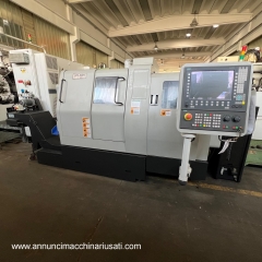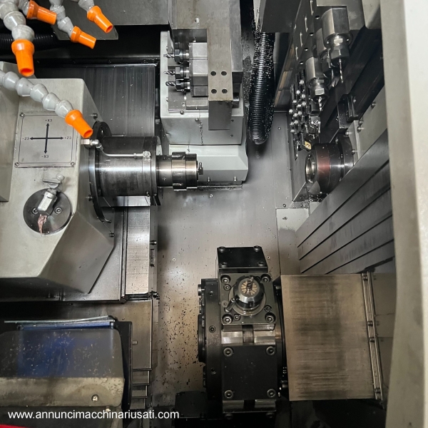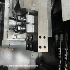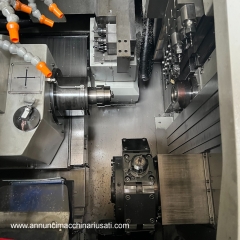 HANWHA Mod. STL38H Tornio cnc a fantina mobile Tornio automatico cnc a fantina mobile 14 Assi (9 lineari + 5 rotanti) 3 Canali 3 Assi Y Mandrino principale asse Z1: Max passaggio barra (mm) 38 – Corsa fantina Z1 (mm) 320 – Giri max (g/min) 8000 – Potenza (kW) 11 / 23 Contromandrino assi X3 – Z3: Diametro foro (mm) 38 – Corsa Z3 (mm) 320 – Giri max (g/min) 8000 – Potenza (kW) 11 / 23 Piastra portautensili: N° 5 utensili di tornitura (16 x 16) – N° 4 utensili rotanti (installati 3) – Velocità mandrini (g/min) 6000 – Potenza motorizzati (kW) 1,6 Torretta revolver assi X2 – Y2 – Z2: N° 10 stazioni BMT45 – Sezione utensili di tornitura (mm) 20 x 20 – N° stazioni motorizzabili 10 – Potenza motorizzazione (kW) 6 – Velocità utensili motorizzati (g/min) 6000 Lavorazioni posteriori fisse: N° utensili fissi 4 – Diametro mandrini portapunta (mm) Ø 32 / 25 Lavorazioni posteriori con asse Y3 (opzionale): Max stazioni 8 – N. 4 utensili motorizzati – Potenza (kW) 1,6 – Velocità mandrini (g/min) 6000 Controllo numerico Siemens 840D Dispositivi e Accessori: Funzioni Assi C su mandrino e contromandrino – Indexaggio su mandrino e contromandrino 0,001° incrementale – Nastro trasporto pezzi finiti – Volantino MPG – Flussostato – Lampada area di lavoro – Schemi elettrici – Chiller mod. SIOC 750CT – Convogliatore trucioli – Cassa accessori – Vari Portautensili fissi e motorizzati – Refrigerazione – Funzione di autospegnimento