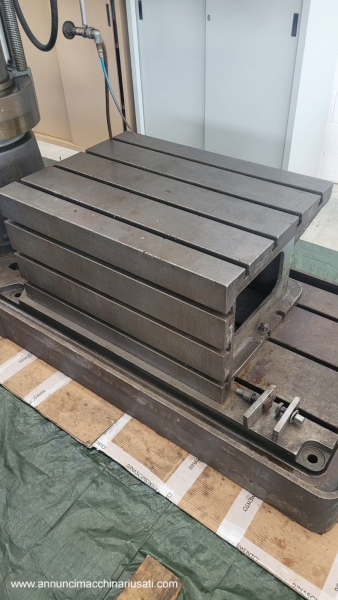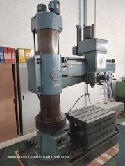 ACCESSORI MACCHINA: -Blocco rapido della colonna sul montante e della testa sul braccio -Blocco automatico degli spostamenti verticali del braccio -Servocomandi elettro-idraulici -Testa con preselettore di velocità e doppia frizione -Freno automatico del mandrino -Cubo di staffaggio dimensioni 1010x700x600 mm Capacita foratura in acciaio R.50/60 50 mm Capacita di foratura in ghisa G22 60 mm Filettatura acciaio 50 mm Filettatura ghisa 60 mm Potenza motore mandrino 5,5 HP Corsa canotto mandrino 350 mm Diametro mandrino canotto 70 mm Cono morse n.5 N. velocità / giri del mandrino 12 nr. / 38-1500 giri/min Numero avanzamenti 8 nr Avanzamento per giro 0.06-0.55 mm Sbraccio utile 1600 mm Corsa verticale del braccio 700 mm Diametro colonna 350 mm Raggio MAX di foratura 1775 mm Raggio MIN di foratura 475 mm Corsa orizzontale della testa 1300 mm Distanza min/max mandrino basamento 750 / 1450 mm Superficie utile del basamento 1710x950 mm Dimensioni ingombro macchina 2475x960xH3100 mm Peso della macchina 3800 Kg