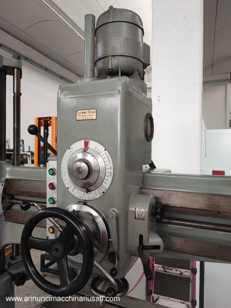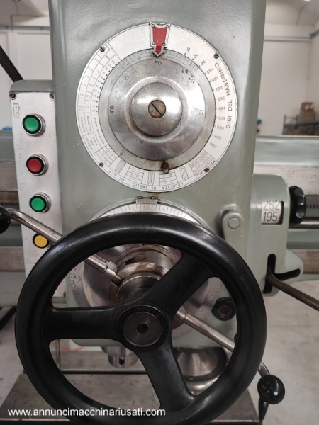 ACCESSORI MACCHINA: -Cubo di staffaggio inclinabile graduato dimensioni: 660x560xH560 mm Capacita foratura in acciaio R.50/60 (avanz. 0.2) 40 mm Capacita foratura in acciaio R.50/60 (avanz. 0.3) 35 mm Capacita di foratura in ghisa G22 45 mm Filettatura acciaio 32 mm Filettatura ghisa 40 mm Potenza motore mandrino 3 HP Corsa canotto mandrino 300 mm Diametro canotto mandrino 70 mm Cono morse n.4 N. velocità / giri del mandrino 12 nr. / 50-1750 giri/min Numero avanzamenti 4 nr Avanzamento per giro 0.05-0.3 mm Sbraccio utile 1100 mm Diametro colonna 250 mm Raggio MIN di foratura 350 mm Raggio MAX di foratura 1225 mm Corsa orizzontale della testa 875 mm Corsa verticale del braccio 600 mm Distanza min/max mandrino basamento 700 / 1300 mm Superficie utile del basamento 1010x700 mm Dimensioni ingombro macchina 1600x700xH2680 mm Peso della macchina 1900 Kg