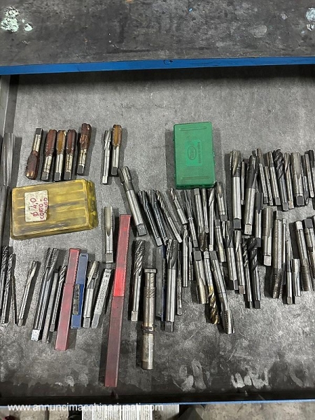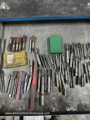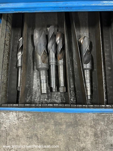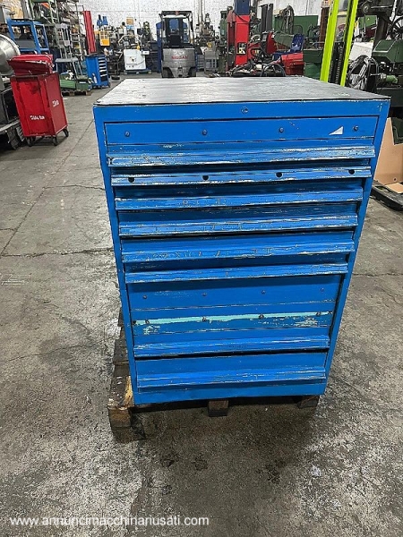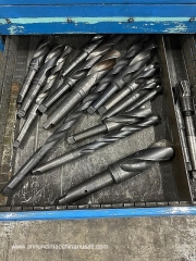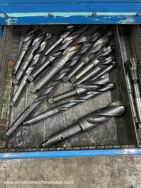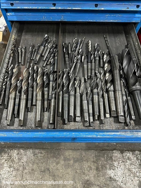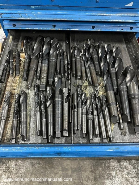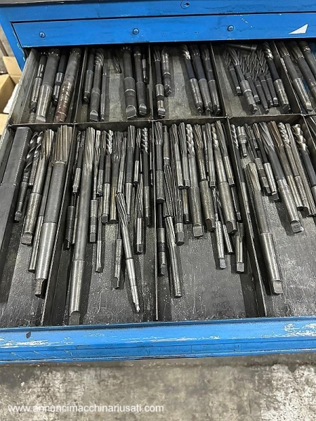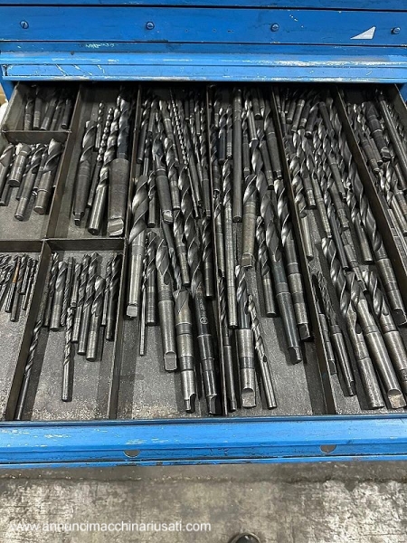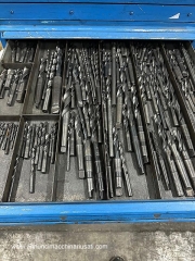Cassettiera con 11 cassetti contenenti: 75 maschi per filettare 95 alesatori da macchina 25 lamatori da macchina 252 punte a baionetta con misure grosse come: 75,65,60,55,50,45,40 ecc.