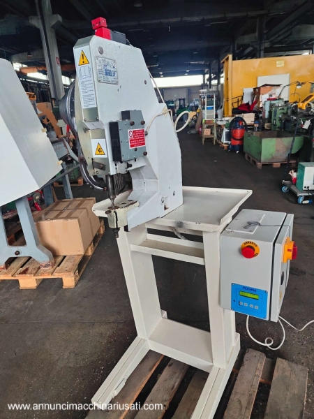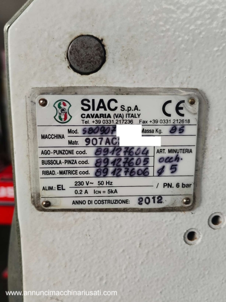 VISIBILE A RIVOLI (TO). Vendesi occhiellatrice professionale a pedale marca SIAC / IAMET per applicazione su materiali vari (materiali plastici,carta, cartone, compositi, pelle, tessuti naturali e sintetici, ecc.). Anno 2012, a norma CE, completa di accessori visibili in foto e manuale d'uso/manutenzione. Dimensioni d'ingombro approssimative cm 76x65xH145 N.B: manca il pedale, da acquistare a parte. Richiesta Euro 800,00 oltre iva