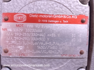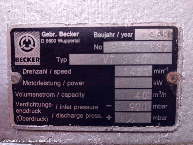 نوع الآلة: مضخة تفريغ دوارة ذات ريش تعمل بدون زيت. الصناعات المستخدمة: المستحضرات الصيدلانية، والكيميائية، والتجميلية، والغذائية، والغذائية، والأجهزة الطبية. الميزات الخاصة: مضخة تفريغ دوارة ذات ريش تعمل بدون زيت، من إنتاج شركة Gebr. Becker (فوبرتال، ألمانيا). الوحدة مزودة بمحرك كهربائي ثلاثي الأطوار عالي الأداء من شركة Dietz-Motoren. صُمم هذا الطراز للتطبيقات الصناعية التي تتطلب تفريغًا ثابتًا ونظيفًا، خاليًا من أبخرة الزيت. هيكلها المتين ذو اللمسة النهائية المطروقة وتصميمها المدمج يجعلها مثالية للدمج في الآلات المعقدة أو للاستخدام في المختبرات وورش العمل. الوحدة مزودة بمروحة تبريد مدمجة لضمان أقصى كفاءة تشغيل حتى في دورات العمل المستمرة (S1). السنة: ١٩٨٨، معدل التدفق (الحجمي): ٤٠ م³/ساعة، ضغط المدخل: -٩٠٠ ملي بار (فراغ)، سرعة الدوران الاسمية: ١٤٢٠ دورة في الدقيقة، طراز المحرك: FDR 90 S/95-4 P، نوع مصدر الطاقة: ثلاثي الأطوار (٣~)، الجهد (فولت): ١٩٠-٢٥٥ / ٣٣٠-٤٤٠ فولت | ١٩٠-٢٩٠ / ٣٣٠-٥٠٠ فولت، التردد: ٥٠ / ٦٠ هرتز، سرعة المحرك: ١٤٣٠ دورة في الدقيقة (٥٠ هرتز) / ١٦٨٠ دورة في الدقيقة (٦٠ هرتز)، فئة العزل: ICL. F، درجة الحماية: IP ٥٤ (حماية من الغبار ورذاذ الماء)، فئة الخدمة: S١ (خدمة مستمرة)