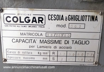 ماكينة قص كولجار موديل CG2 السعة 1000x2 مم مقياس خلفي يدوي مصدر الطاقة 380 فولت قوة المحرك 1.1 كيلو وات الأبعاد الكلية 1700x1500x1200 مم الوزن 900 كجم.