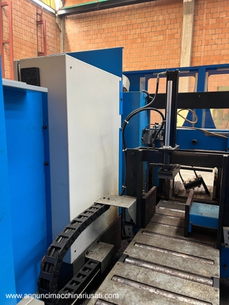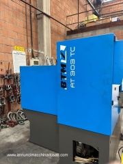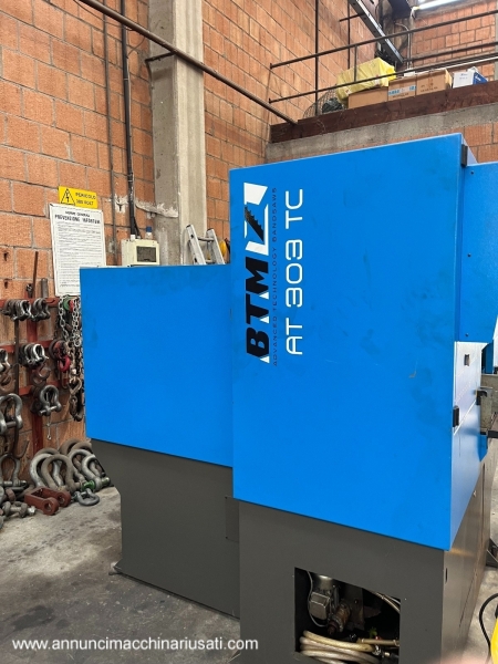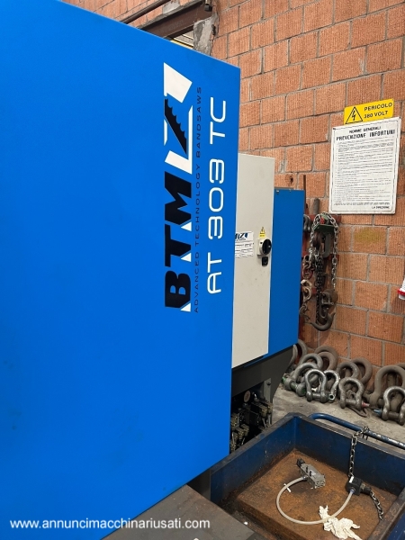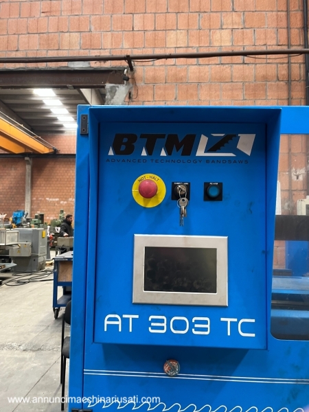 Automatische Bandsäge BTM Modell AT 303 TCT, Baujahr 2022, Zustand: Sehr wenig gebraucht (neuwertig). Schnittkapazität 90°: Rund 300 mm, Quadratisch 300 mm, Rechteckig 300 x 150 mm. Sägeblattabmessungen: 3920 x 34 x 1,1 mm. Arbeitstischhöhe: 830 mm. Leistung Sägeblattmotor: 2,2 kW. Leistung Kühlmittelpumpe: 0,12 kW. Leistung Hydraulikpumpe: 0,75 kW. Leistung Späneförderer: 0,09 kW. Leistung Vorschubwagenmotor: 1,95 Nm (bürstenlos). Wagenhub: 800 mm. Sägeblattgeschwindigkeit: 20: 150 mm/min. Werkstückabsenkung: 0: 200 mm/min. Eilabsenkung: 3500 mm/min. Kühlmitteltank: 80 l. Zentraltank: 80 l. Hydrauliktank: 27 l. Abmessungen: 2050 x 2110 x 1920 mm. Gewicht: 1650 kg. Dokumentation: Bedienungsanleitung und CE-Kennzeichnung. Zertifikat