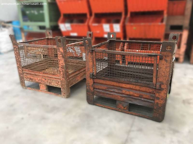 Schwere Serienbehälter, Kisten oder Körbe aus Blech und Stahlgeflecht. Sie sind durch Ineinanderstecken stapelbar und verfügen über „Ohren“ mit Löchern zum Heben mit einem Kran/Laufkran.