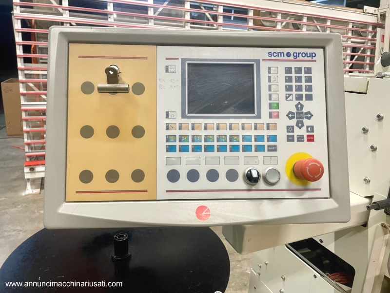 Gebrauchte Kantenanleimmaschine SCM OLIMPIC K1000, Bedienfeld mit Folientastatur. Technische Daten: Min. Plattenhöhe 8 mm, Max. Plattenhöhe 55 mm, Min. Dicke der Rollkante 0,4 mm, Max. Dicke der Rollkante 3 mm, Max. Dicke der Holzkante 12 mm. Zusammensetzung: Streifenkantenmagazin, Leimbeckenkapazität 1,5 kg mit unabhängigem Motor, Nr. 4 Gegendruckrollen mit pneumatischem Schub und 1. Rolle mit unabhängigem Motor, Schere zum Schneiden der Rollkante, Kappaggregat mit 2 unabhängigen Motoren, schwenkbar 0-15° – jeder KW 0,35 – 12.000 U/min, Überlappfräsaggregat mit 2 Motoren, jeder KW 0,65 – 12.000 U/min – Werkzeuge mit umkehrbaren Messern, schwenkbares Fasaggregat zum Ausführen von Flachkanten- und Radiusbearbeitung; jeweils 2 Motoren. KW 0,5 - 12.000 U/min mit elektropneumatischer Positionierung - Werkzeuge mit Wendemessern elektropneumatischer Ausschluss der Gruppe Leimabstreifgruppe Maschinenlänge mm. 4310 Baujahr 2009 CE