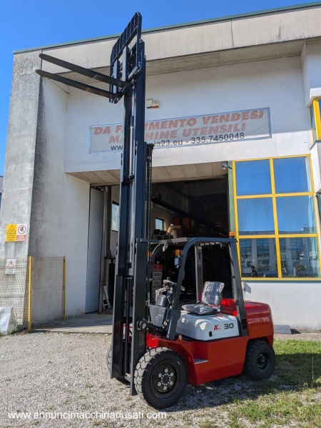 For sale diesel forklift with a capacity of 30 quintals Visible in the province of Treviso For further information I remain at your disposal CAPACITY 30 QUANTITIES YEAR 2024 LIFTING HEIGHT 4400 MM WITH FREE LIFT FORK LENGTH 1200 MM DIESEL POWERED BY 4-CYLINDER 38 KW ENGINE ACCESSORIES SIDETRACTOR, FRONT/POSTER HEADLIGHTS + INDICATORS + FLASHING LIGHT DEMONSTRATION VEHICLE - LIKE NEW