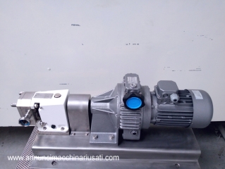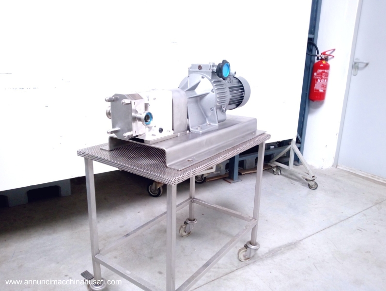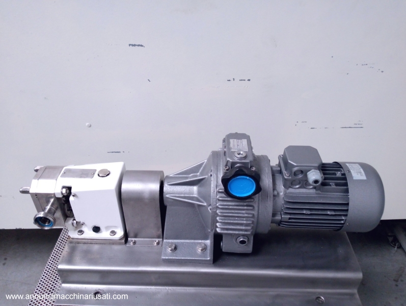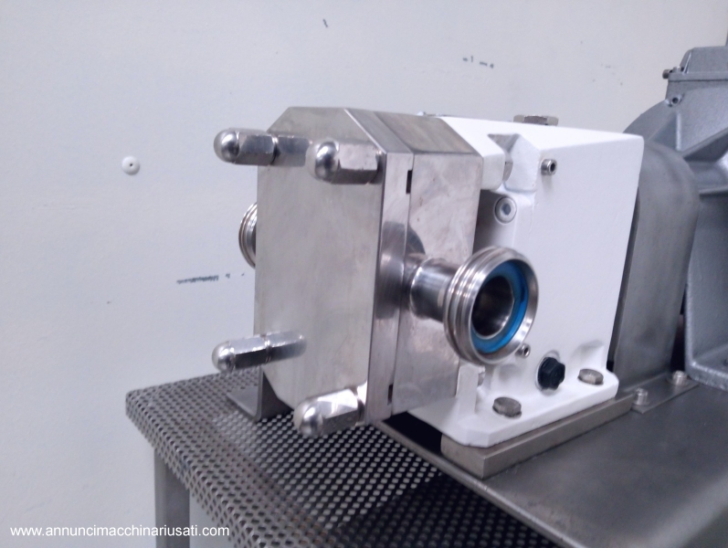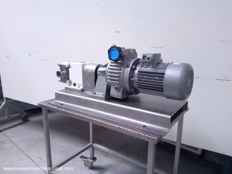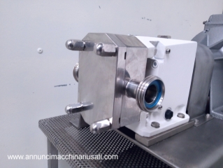 MACHINE TYPE: Positive displacement lobe pump. INDUSTRY OF USE: Food, dairy, beverage, and pharmaceutical industries. SPECIAL FEATURES: The SLR 1-25 pump is designed for the gentle transfer of viscous or particle-containing fluids, such as yogurt and creams. Coupled with a gearmotor, it ensures optimal speed and torque management, meeting the precision requirements of the food industry. YEAR: 2003. Voltage: 380 Volts. Dimensions (W x D x H): 800 x 700 x h.700 mm. Weight: 60 kg.