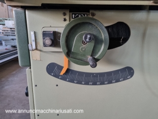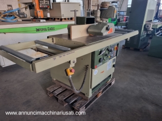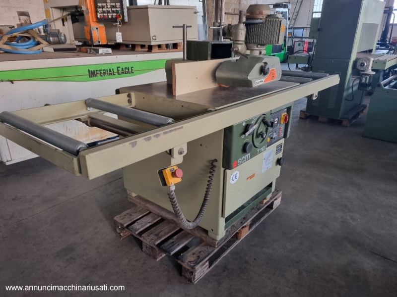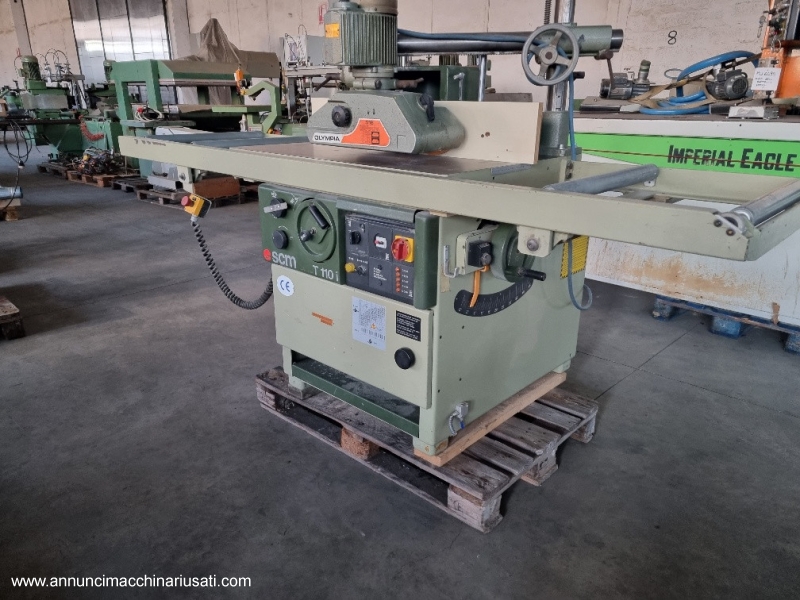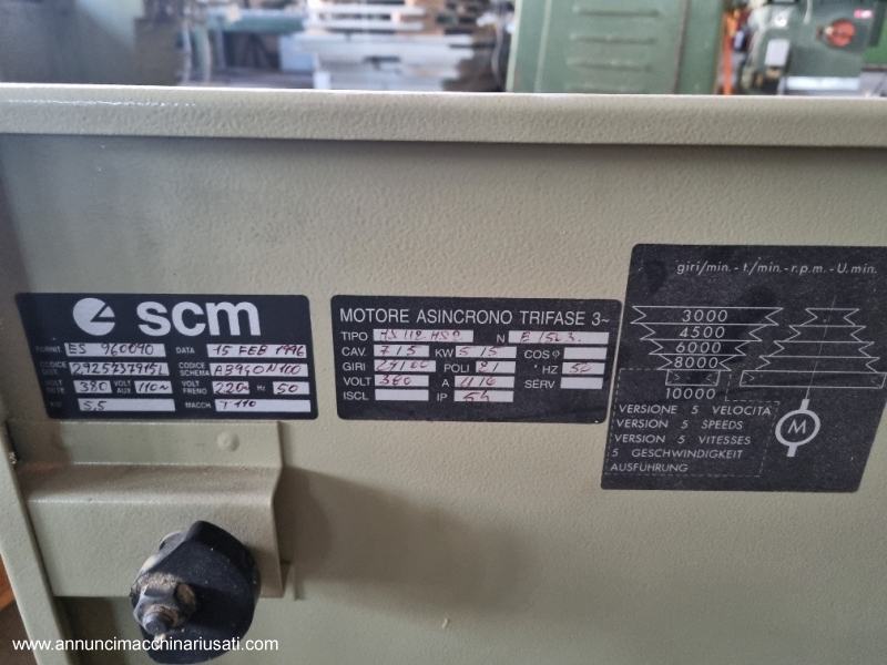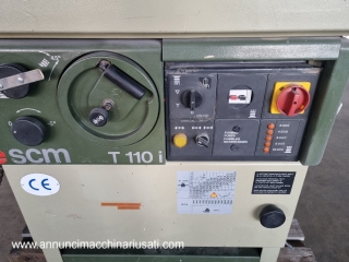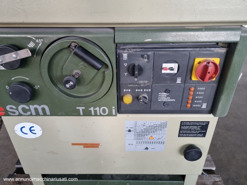 Spindle moulder with tilting shaft - SCM T110i year of construction 1996 CE standard machine shaft diameter 35 mm tiltable from -5° to +45° motor power 5.5 kw (7.5 hp) max tool diameter 320 mm rotation speed 3000/4500/6000/8000/10000 rpm table with idle roller extensions and opening panel support Olympia 518 3-wheel feeder voltage 380V-50Hz-3ph transport dimensions 2500x1500x1500h mm weight 500 kg