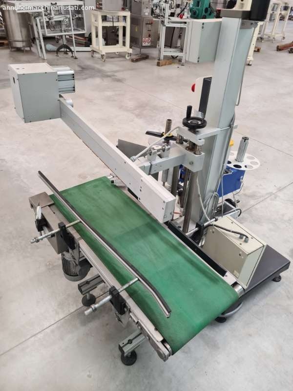 It is also equipped with an entry conveyor belt for conditioning the products arriving from the line, a light column with color buzzer for signaling the running states, alarm, pre-alarm and system control push-button panel. Year of construction: 2003