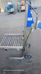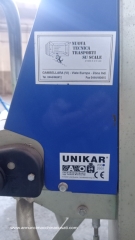 Elevador manual especial UNIKAR. Datos técnicos --- Velocidad de funcionamiento: 70 mm por vuelta de manivela (vuelta completa en 16 vueltas). Capacidad de carga: 120 kg. Altura de elevación: 1100 mm. Ruedas traseras: 200 mm con rodamientos de bolas. Ruedas delanteras: pivotantes dobles de 50 mm de diámetro con rodamiento cónico. Peso neto: 25 kg. Bastidor: acero galvanizado.
