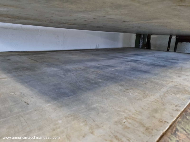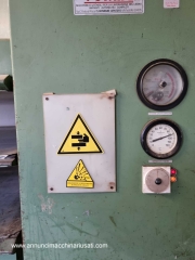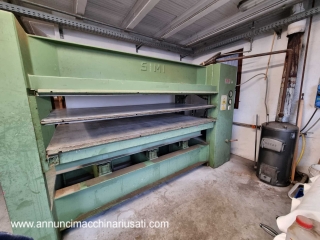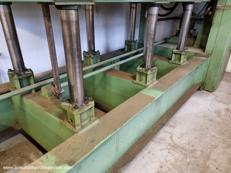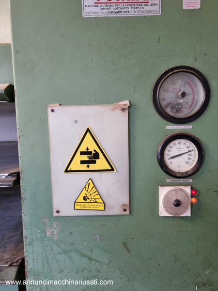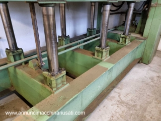 Prensa en caliente - SIMI 2500x1300 máquina no conforme con la CE calentamiento de agua de las placas tamaño de las placas 2500x1300 mm abertura del compartimento de las placas intermedias 220 mm cada una n.º 6 pistones diámetro 80 mm cada uno presión máxima 90 toneladas caldera de madera/diésel Sceat 27.000 Kcal/h con bomba de circulación funcionamiento verificado (vídeo disponible a petición) dimensiones de transporte 3500x1500x2200h mm peso 3000 kg