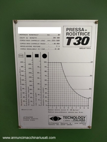 TECNOLOGÍA MARCA MODELO T30/ POTENCIA 30 TON ESPESOR MAX NIBRADO 6 MM CARRERAS POR MINUTO 310/480 TENSIÓN 380 V ALTURA DE TRABAJO 1000 MM ACCESORIOS VISOR ELBO, CARRO CON PUNZONES Y PLANTILLAS
