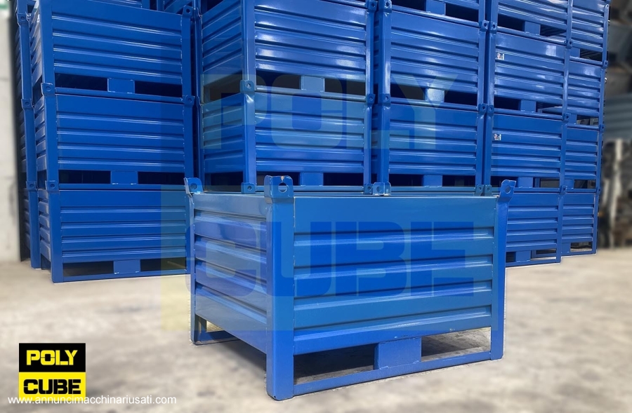 Contenitori metallici industriali in lamiera grecata con fori per sollevamento, impilabili ad incastro, slitte sul lato lungo e 4 pareti chiuse. PRODOTTO NUOVO. Colore Blu ral 5010 Misure nominali 100x800h695 interne 100x800h500 portata kg1000 Possibilità di spedizione anche per piccoli quantitativi. Proposta da Polycube srl, salvo il venduto. Preventivo su richiesta. disponibili in pronta consegna altri modelli visionabili sul ns. sito: polycube.it