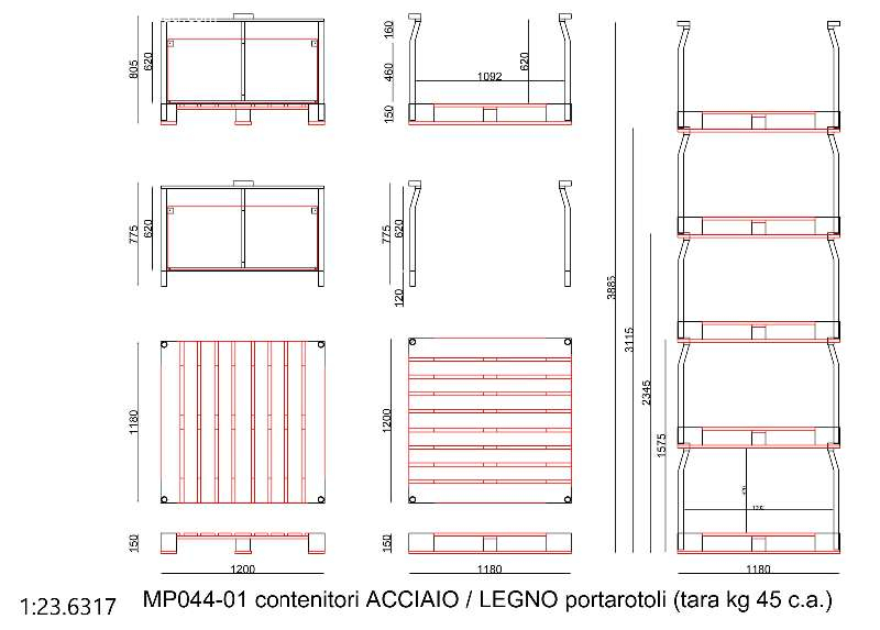 Ils sont polyvalents, adaptés à la manipulation et au stockage de rouleaux/pièces de tissu, profilés, barres, tubulaires, etc. etc. La base est constituée d'une plate-forme en bois robuste avec des inserts périmétriques en acier où les côtés sont insérés, ceux-ci sont réalisés avec un tube rond en acier peint de 37 mm et avec un remplissage en stratifié/mdf/contreplaqué.
