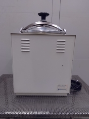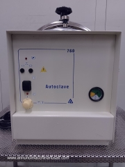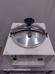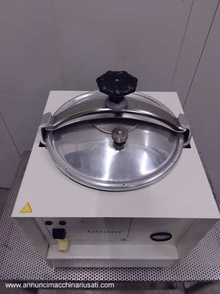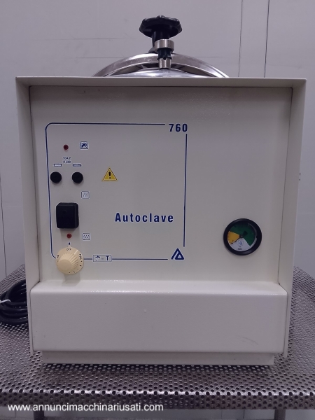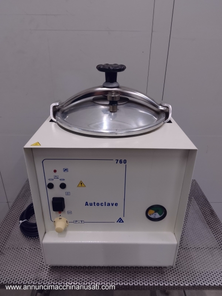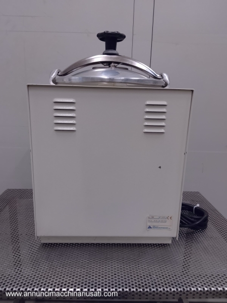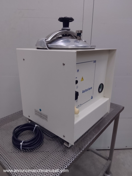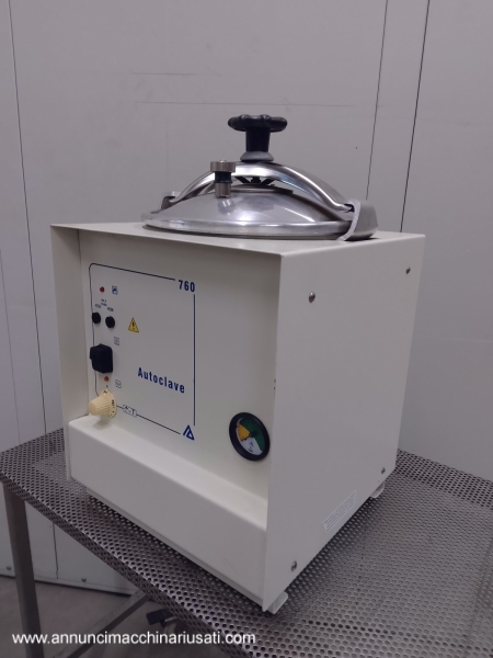 TYPE DE MACHINE : Autoclave à vapeur pour stérilisation. SECTEURS D'UTILISATION : Pharmaceutique, chimique, cosmétique, alimentaire, diététique, dispositifs médicaux. DÉTAILS : L'autoclave modèle 760 est un stérilisateur à vapeur conçu pour des cycles de stérilisation fiables et efficaces. Fonctionnant à une pression de 1 atm, il atteint une température de stérilisation de 121 °C, conforme aux paramètres standard de stérilisation à la vapeur saturée. L'appareil est équipé d'une chambre de stérilisation de 20 litres en acier inoxydable, conforme aux exigences de la directive 97/23/CE (DESP). Le couvercle en acier inoxydable avec système de verrouillage mécanique garantit la sécurité pendant le fonctionnement. Le chauffage est assuré par une résistance électrique radiale, contrôlée par une minuterie réglable de 0 à 120 minutes, pour un contrôle précis du cycle de stérilisation. Les paramètres du processus sont contrôlés par un manomètre analogique et un thermomètre numérique. La sécurité de fonctionnement est garantie par un capteur de protection à réarmement manuel en cas de manque d'eau. L'autoclave est équipé d'un interrupteur principal et de voyants lumineux. Le boîtier extérieur en acier revêtu de poudre résistant aux acides assure robustesse et facilité de nettoyage. Pour le cycle de stérilisation, 3 litres d'eau déminéralisée ou désionisée suffisent, ce qui rend l'appareil particulièrement économe en énergie. Grâce aux limites de capacité et de pression de service, l'autoclave n'est pas soumis aux inspections ISPESL. CARACTÉRISTIQUES TECHNIQUES Dimensions internes de la chambre de stérilisation : diamètre 280 x 330 mm Capacité de la chambre de stérilisation : 20 litres Dimensions hors tout : 400 x 360 x 560 mm Poids : 20 kg Alimentation : 230 V – 50 Hz Puissance absorbée : 1500 W Fusibles de protection : 2 x 10 AF (5 x 20 mm) Prise secteur : 16 A