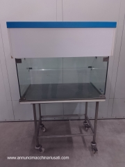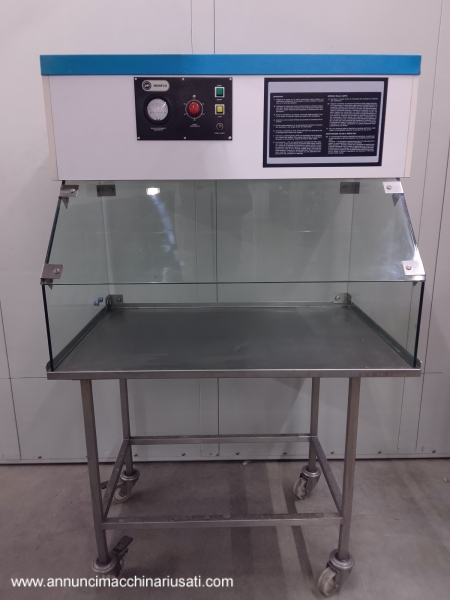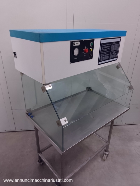 TYPE DE MACHINE : Hotte à flux laminaire vertical. SECTEURS D'UTILISATION : Pharmaceutique, chimie, cosmétique, agroalimentaire, dispositifs médicaux. PARTICULARITÉS : La hotte à flux laminaire vertical PBI MINIFLO est conçue pour garantir un environnement de travail protégé grâce à un flux d'air vertical unidirectionnel filtré. Sa structure est composée de panneaux supérieurs peints, de parois latérales et frontales en verre transparent et d'un plan de travail en acier inoxydable. Le système de ventilation assure une distribution uniforme de l'air sur la surface de travail, réduisant ainsi le risque de contamination des produits manipulés. Le panneau de commande frontal intègre un manomètre, un variateur de vitesse de ventilation, un interrupteur principal, la commande d'éclairage et une protection par fusible. Tension d'alimentation : 220 V. Puissance installée : 250 W. Fréquence : 50 Hz. Dimensions (L x P x H) : 950 x 600 x 800 mm. Poids : 50 kg