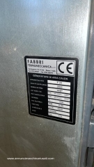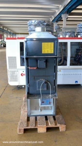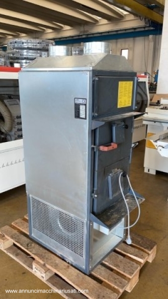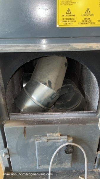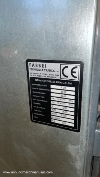 Générateur d'air chaud Fabbri F28, année de production 2022. Pour des surfaces de 100 à 150 m² ou 500 m³. Dimensions : 570 x 1560 x 920 mm, diamètre de la cheminée : 160 mm. Poids : 170 kg. Ce poêle est conçu pour fonctionner avec des combustibles solides. Il est également possible d'y installer un brûleur à diesel ou à granulés.