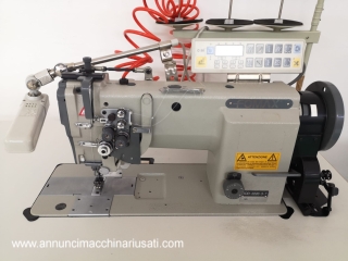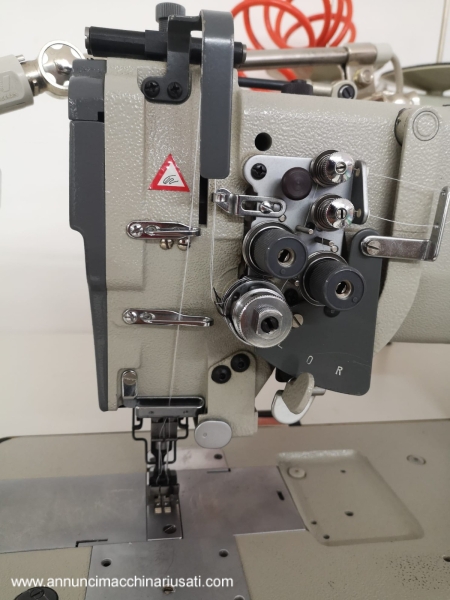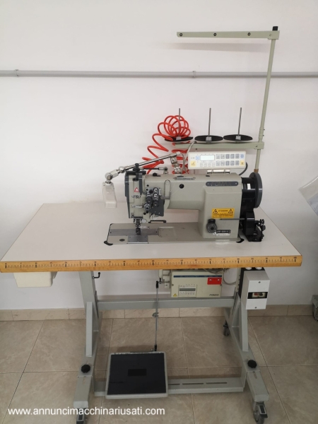 Machine à 2 aiguilles, mécanisme de lubrification automatique via pompe à huile et mécanisme de désengagement des aiguilles pour réaliser des coins ou des coins fermés. Equipée d'un coupe-fil et d'un releveur automatique du pied-de-biche. Vitesse de couture 2 500 points/min Equipé d'un moteur et d'un banc intégrés.