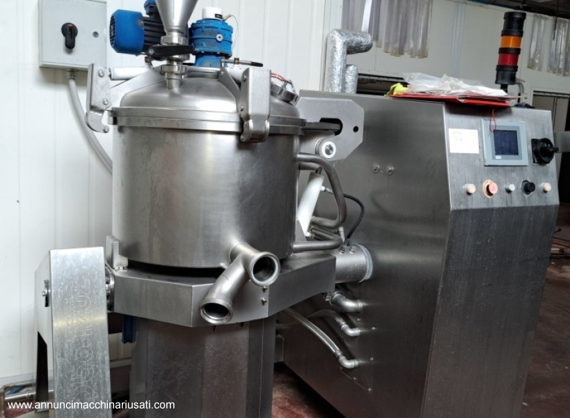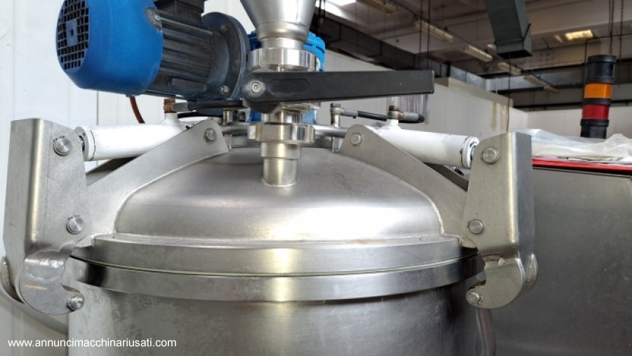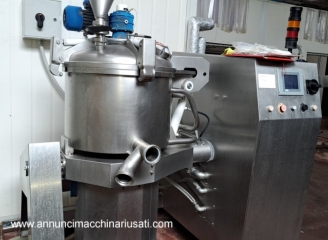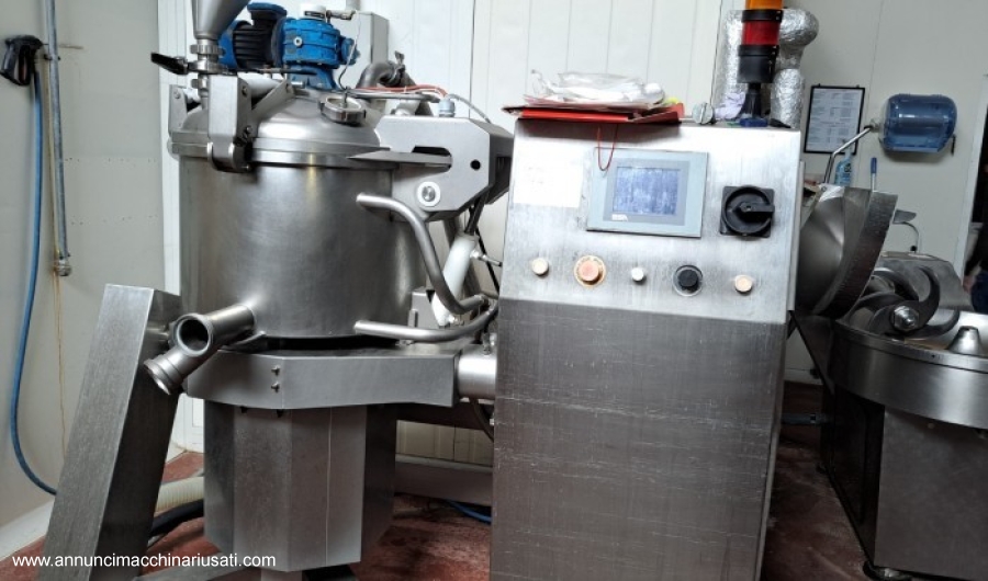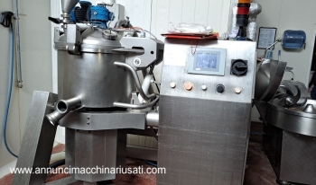 Système de transformation compact et polyvalent, capable d'intégrer différentes machines dans un processus unique pour la préparation industrielle de sauces, crèmes, confitures, risottos, etc. Piloté par une unité de contrôle informatisée pour une automatisation complète des préparations, il coupe, cuit et pétrit, même sous vide, grâce à des séquences mémorisées et répétables : programmation simple et intuitive avec écran tactile. Capacité de la cuve : 120 litres. Acheté en 2008. En parfait état de fonctionnement.
