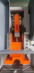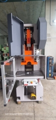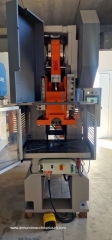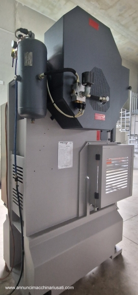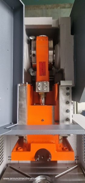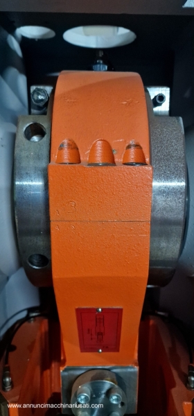 CARATTERISTICHE TECNICHE: Pressa Modello: T50 CNR4 Anno di costruzione: 1999 Forza nominale: kN 500 Massa: Kg. 3.500 Colpi al minuto: N° 90 Inserzioni max. al minuto: N° 41 Pressione aria di esercizio min./max.: BAR 4÷5,5 Tempo d’arresto: s 0,117 Distanza si sicurezza: mm 187 Energia: KJ 2000 Corsa regolabile min./max.: mm 8÷100 Regolazione mazza: mm 70 P.M.I regolazione alta: mm.280 Corsa massima di estrazione: mm. 30 Superficie piano lavoro: mm 770x530x58 Dimensione piano mazza: mm. 450x300 Distanza piano lavoro-mazza mm: 275 Diametro del codolo: mm. 45 Sporgenza dal centro: mm 270 Dimensione max. stampo: mm. 450x300 Massa stampo superiore: Kg. 84 Voltaggio: V 400 Sovraccarico idraulico Completa di manuale d’uso e conformità CE Garanzia sei (6) mesi escluso parti elettroniche INSTALLATI COMPONENTI NUOVI: • Cuscinetti motore; • Cuscinetti volano; • Cinghie motore; • Lamelle frizione; • Ripari antinfortunistici anteriori; • Piano lavoro ravvivato su macchina CNC; • Pedaliera; • Quadro elettrico; • Pompa sovraccarico idraulico